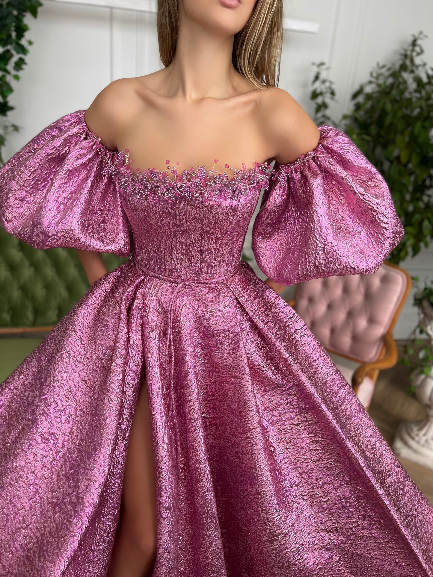 -Made of shiny rose brocade